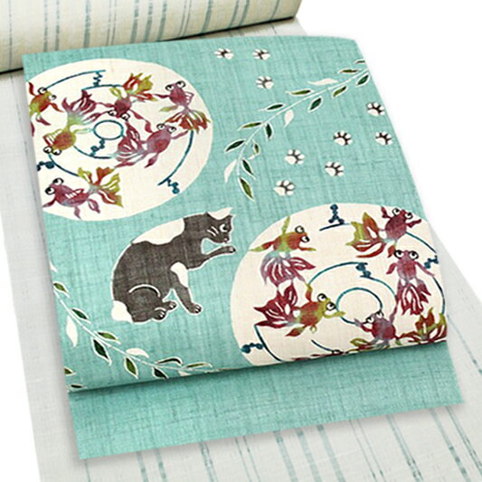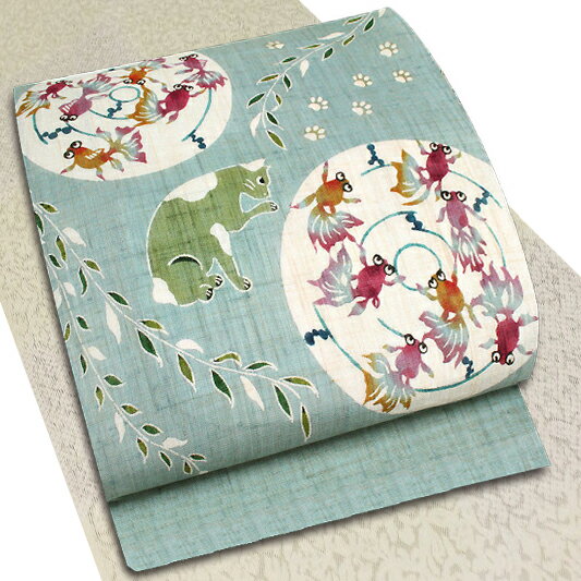 栗山吉三郎 名古屋帯 猫 ねこ 栗山紅型 和染紅型 紅型染 薄青緑色 猫と金魚 金魚 きんぎょ 金魚すくい 足跡 猫の肉球 出目金 九寸 麻 手積み 手織り 夏物 新品 未仕立て お洒落着 カジュアル かわいい おしゃれ かっこいい モダン 涼しい 透け 受注生産 和装 着物 No.88-1635
