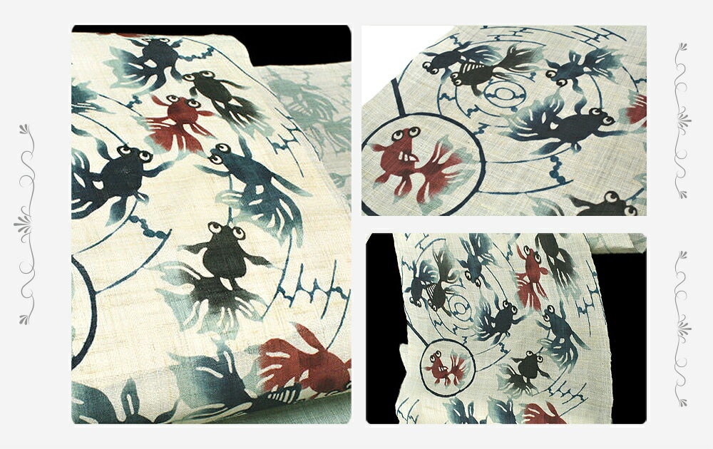 栗山吉三郎 名古屋帯 栗山紅型 和染紅型 紅型染 浅青緑色 水色 エメラルドグリーン 金魚 きんぎょ 金魚すくい 出目金 九寸 麻 手積み 手織り 夏物 新品 未仕立て お洒落着 カジュアル かわいい おしゃれ かっこいい 粋 モダン 涼しい 透け感 東京紅型 江戸紅型 本紅型 琉球紅型 受注生産 No.88-1570 サイズ表 サイズ cm 仕立て可能長さ 〜375cm 幅 通常 ※お仕立ての際、ご希望の寸法がある場合は注文時に必ずご指定ください。