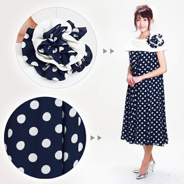 ※モデル身長:165cm 【 パーティドレスレンタル 】 ■ カラー:紺(水玉) ■ 素材:ポリエステル ■ デザイン:ワンピース(水玉ストール、花コサージュ付) ■ サイズ:9-13号/着丈:116cm/肩幅:37cm/バスト:〜106cm/ウエスト:〜82cm/ヒップ:〜110cm サイズなどについて詳しくは「貸衣装ネット便」までお気軽にお問い合わせ下さい。