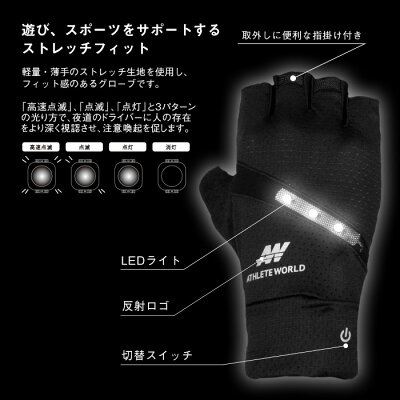 10双販売 アスリートワールド3LEDフラッシュグローブ 3パターンの光り方で夜道での存在をアピール! オープンフィンガータイプで、ダイレクトな感覚で作業可能! 軽量・薄手のストレッチ生地を使用し、フィット感のあるグローブです。