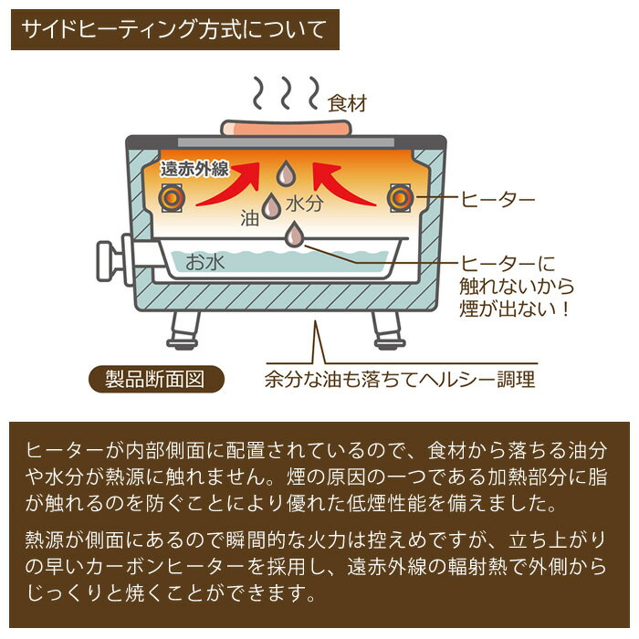 食材から滴る油分がヒーターに触れにくい構造で煙を大幅にカットします。