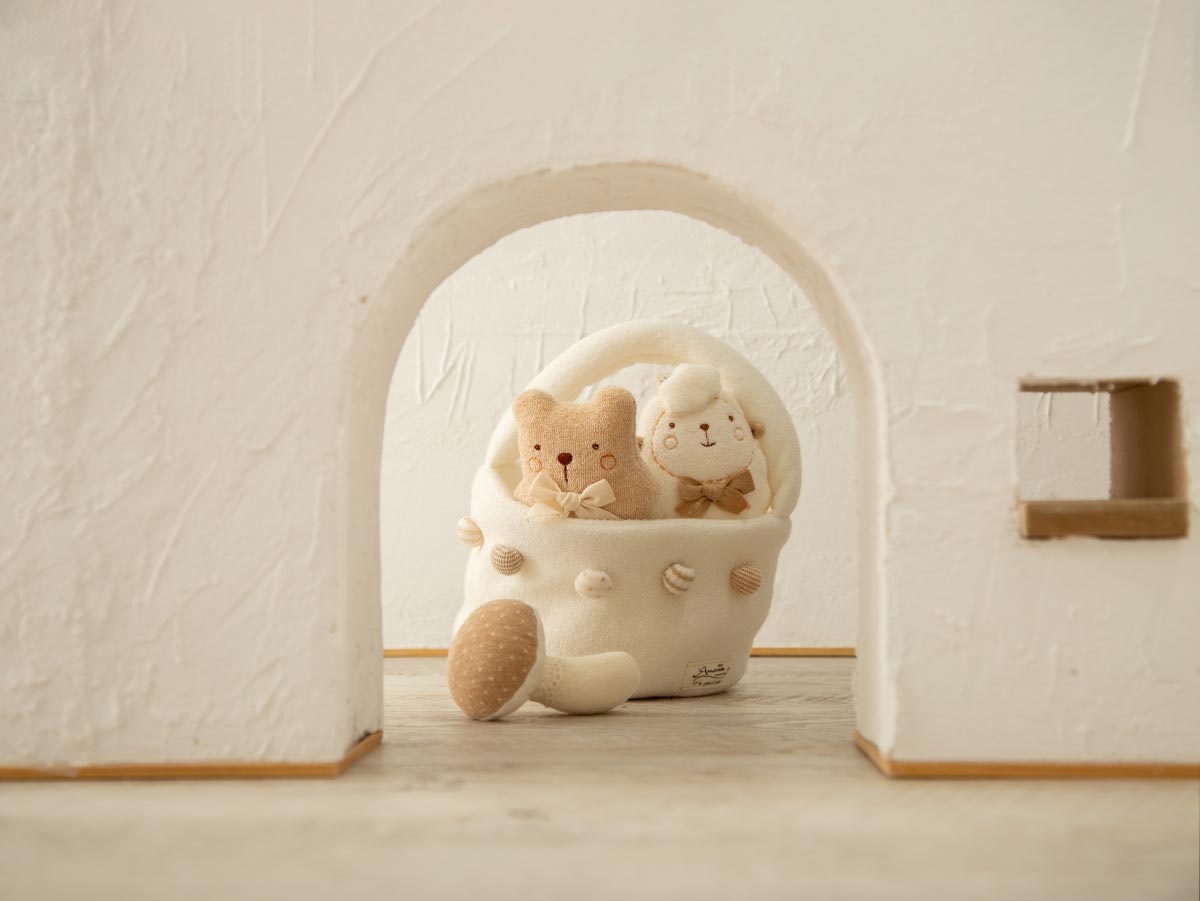 鈴入りで遊んでたのしく、終わったらバスケットに入れて好きなところへお運びくまやうさぎ、野菜たちもみんなバスケットの中におすすめのスタイはこちらオーガニック100%の触りごこちくまひつじきのこうさぎひつじにんじんオーガニック100%だからこその優しいしっとりとした肌触りです。