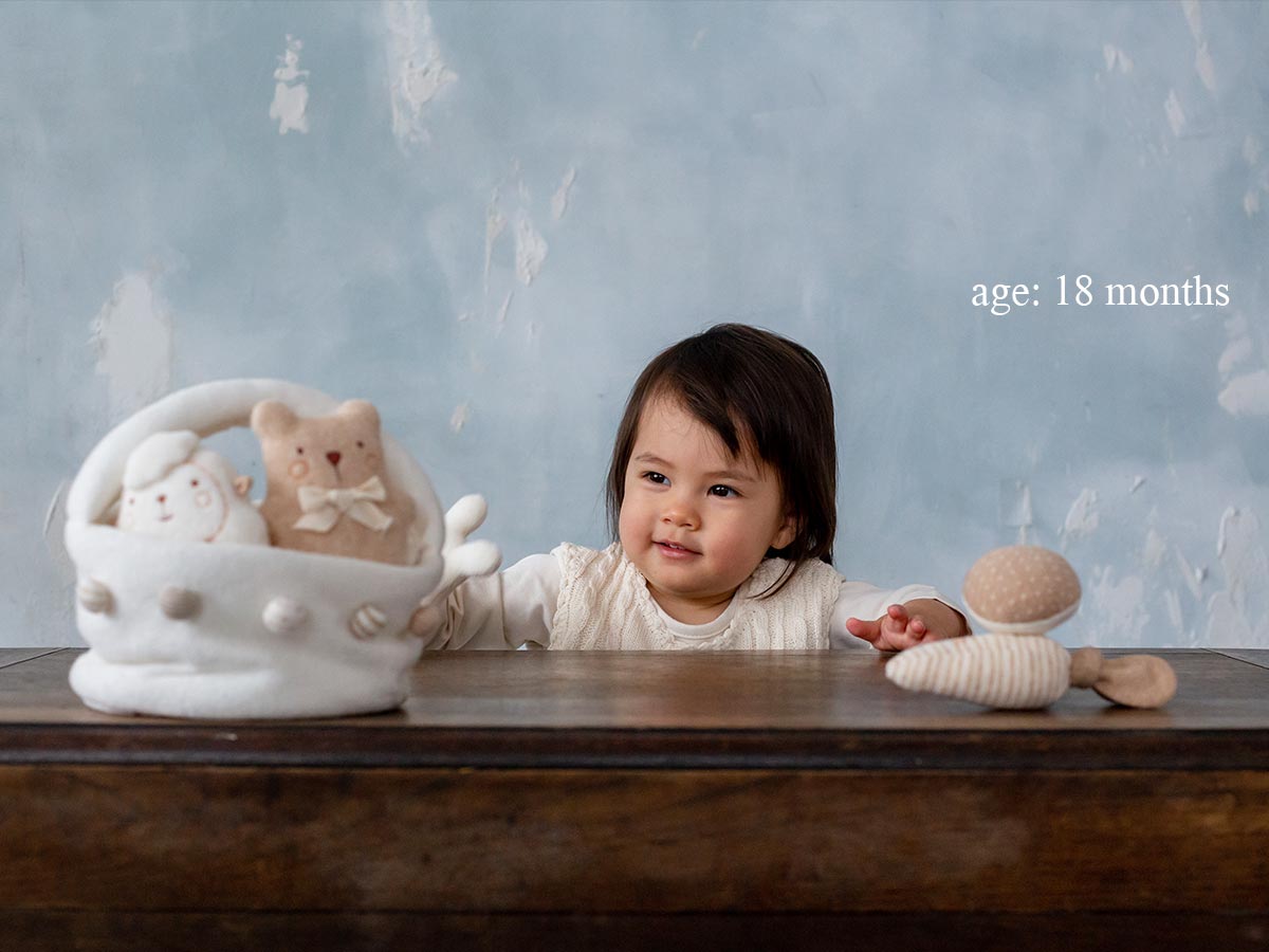 にぎにぎが3つ入るちょうどいいサイズのバスケットは、パイル生地で柔らかく、お気に入りのおもちゃを入れて思わず歩き始めたくなるはず。