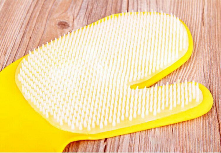 長めのゴム手袋にブラシが付いているブラッシンググローブです。