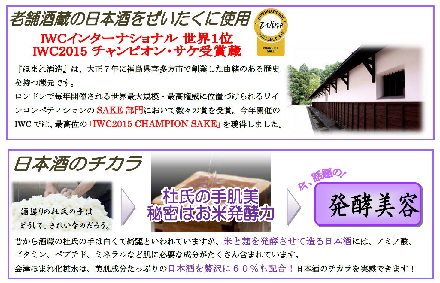 会津ほまれ化粧水は、美肌成分たっぷりの日本酒を贅沢に60%も配合 日本酒のチカラを実感できます! 1