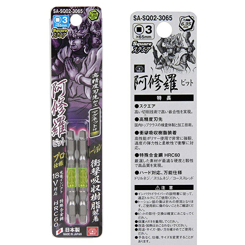 SK11 阿修羅ビット スクエア 2P SA-SQ02-3065 スクエア3×65mm マグネット付 六角軸6.35mm 2本入り メール便対応(8個まで) 4977292306874