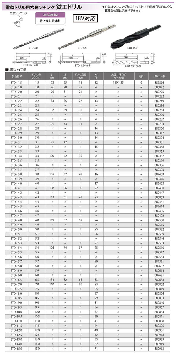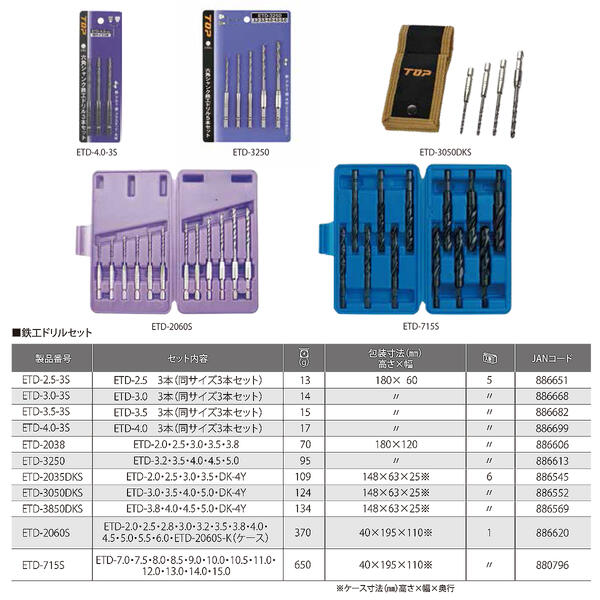サイズバリエーション【鉄工ドリルセット】2.5mmX3本 (ETD-2.5-3S)3.0mmX3本 (ETD-3.0-3S)3.5mmX3本 (ETD-3.5-3S)4.0mmX3本 (ETD-4.0-3S)2.0mm~3.8mm 5本セット (ETD-2038)3.2mm~5.0mm 5本セット (ETD-3250) 2.0mm~6.0mm 12本セット (ETD-2060S) 7.0mm~15.0mm 12本セット (ETD-715S) 【六角シャンクドリル用ケース付セット】2.0mm~3.5mm 4本セット (ETD-2035DKS)3.0mm~5.0mm 4本セット (ETD-3050DKS)3.8mm~5.0mm 4本セット (ETD-3850DKS)六角シャンクドリルバリエーション鉄工ドリル (1.5mm~15.0mm)鉄工ロングドリル (1.5mm~6.5mm)鉄工ドリルセット薄板ドリル (2.0mm~10.0mm)コンクリートドリル (2.5mm~6.5mm)コンクリートロングドリル (3.4mm~6.5mm)コンクリートドリルセット コバルトドリル (2.0mm~13.0mm)テーパー下穴錐 (2.0mm~6.0mm)六角シャンクドリル用ケース (DK-4Y) ※各サイズはリンク先のページ内でご確認下さい。