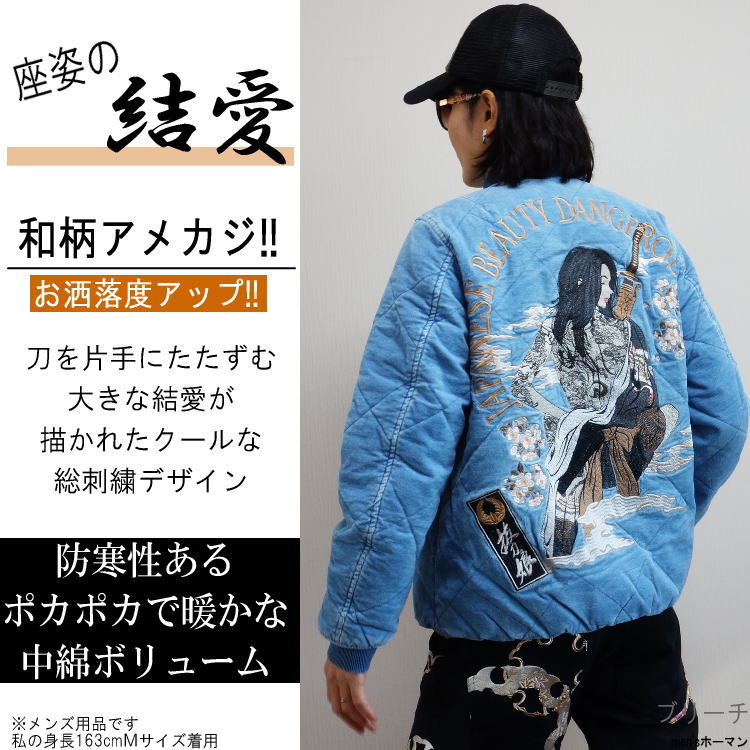 セール特価 半額以上値下げ 53%OFFSALE 雑誌Japonica掲載【ビッグ有】抜刀娘/バットウムスメ【送料無料】結愛刺繍 中綿キルト MA-1フライトジャケット/ブルゾン インディゴ/水色ブリーチ M/L/XL/XXL【YDKG-k】274143