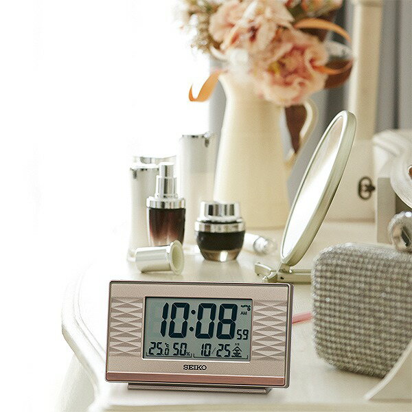 SEIKO CLOCK (セイコークロック) 置き時計 ピンクゴールド 本体サイズ:7.8×13.5×3.8cm 目覚まし時計 電波 デジタル SQ791P 製品特徴 ●その日の気分やライフスタイルに合わせて 選べる3つのスヌーズ機能つき●やさしく軽やかなカラーリングが魅力 ■ ■ spec ■ ■ 本体サイズ (約)78×135×38mm 本体重量 (約)190g 枠材 プラスチック枠(ピンクゴールド塗装) 前面:プラスチック 電池 単3(マンガン)×2 備考 取扱説明書、保証書 ◆電波修正機能(40kHz/60kHz自動選局・受信OFF機能つき) ◆2099年までのフルオートカレンダー機能 ◆電子音アラーム(ダンダントーン) ◆スヌーズ ◆アラームオートストップ(約5分間) ◆選べるスヌーズ機能(約5分、ステップダウン、無し) ◆音量切替つき2チャンネルアラーム ◆タイマー(カウントダウン・アップ) ◆温湿度表示(温度測定範囲:0℃〜40℃ 測定精度:±2℃ 湿度測定範囲:25%RH〜85%RH 測定精度:±8%(25℃)) ◆12時間制/24時間制切替式 ◆六曜表示(2030年12月31日まで) ◆ライト 保証期間1年