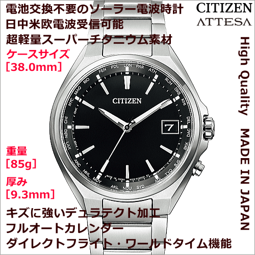 ◆ギフト対応アイコン詳細 ■主な特徴CITIZEN ATTESA/アテッサ エコ・ドライブ電波時計 商品詳細ムーブメントエコ・ドライブ電波時計(光発電2年) 精度:±15秒/月(非受信時)サイズ重量:85g 厚み:9,3mmケースケースサイズ【⇔】:38,0mm ケース:スーパーチタニウム 表面処理:デュラテクトチタンカーバイト(シルバー色) 10気圧防水ガラスサファイアガラス/無反射コーティングバンド三ツ折れプッシュタイプ中留特徴ダイレクトフライト針表示式(ワールドタイム機能) パーフェックス搭載 日中米欧電波受信機能受信局自動選択機能 定時受信機能 強制受信機能 衝撃検知機能 針自動補正機能 充電残量表示機能 充電警告機能 過充電防止機能 ワールドタイム機能(26都市) サマータイム機能■三ツ折れプッシュタイプバンドの参考画像■腕時計のサイズ調整も無料でお受けいたします♪