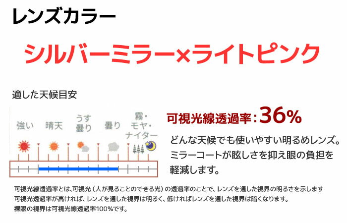 ピンク系は視界をくっきりさせる効果があり、日差しが少ない朝・夕や、 曇っている日でも、使用できるカラーになります。
