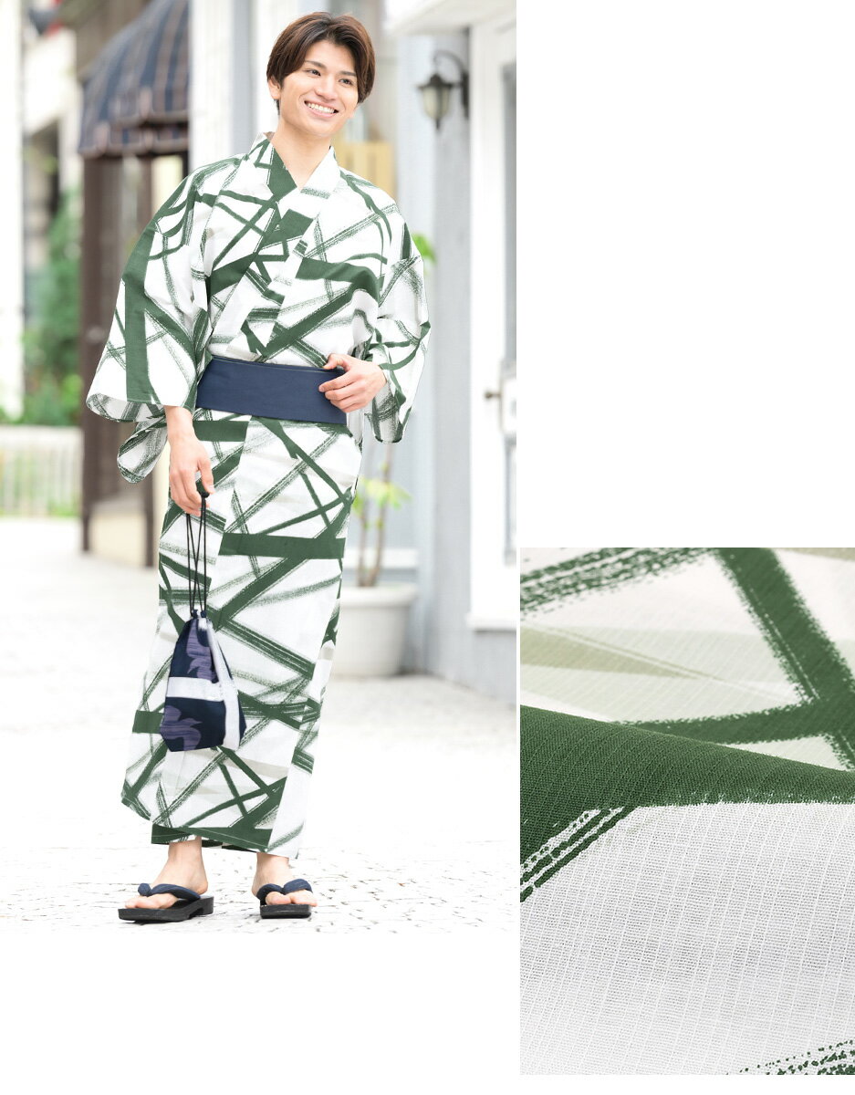 moika 浴衣 メンズ 3点セット Mサイズ Lサイズ レトロ 大人 緑 グリーン 筆 墨 線 幾何学 モダン 男性用 仕立て上がり メール便不可 素材:綿100% 浴衣詳細: Mサイズ身丈 約143cm、袖丈 約51cm、裄丈 約69cm適応身長 168〜173cm Lサイズ身丈 約148cm、袖丈 約51cm、裄丈 約71cm適応身長 173〜178cm 帯詳細: 巾:約10cm、長さ:約380cm 素材: 表面:ポリウレタン100%、ベース:ポリエステル65%、綿35% 無地部分:ポリエステル100% 下駄詳細: Mサイズ長さ:約26cm、幅:約10cm、高さ:約3.5cm 適応サイズ:24.5〜26cm Lサイズ長さ:約27cm、幅:約10.5cm、高さ:約3.5cm 適応サイズ:25.5〜27cm 素材:台:桐 ・洗濯について ご自宅でもお洗濯可能な洗える着物です。