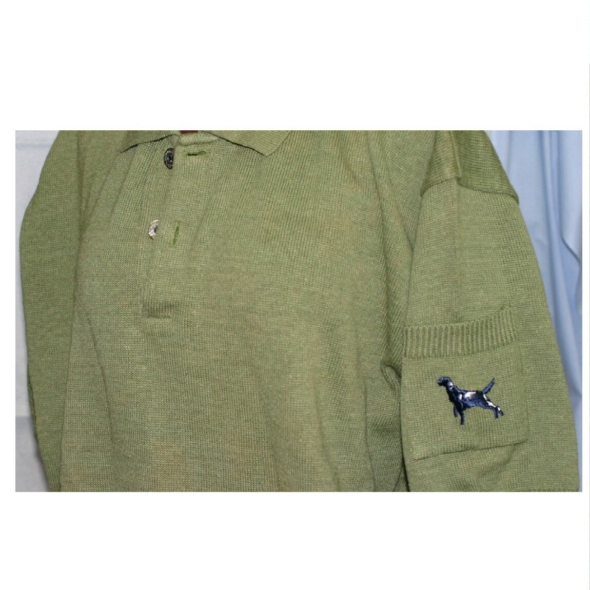【中古】本物綺麗ケンコレクション紳士用半袖襟付き暖かいニットセーター深緑色袖に紺色の犬の刺繍 〇D11-58-8