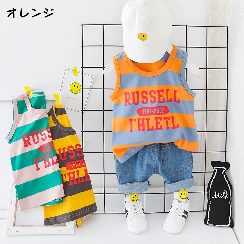 ボーダー柄&アルファベットがお洒落なタンクトップとデニムショートパンツのキッズ用上下2点セットです。
