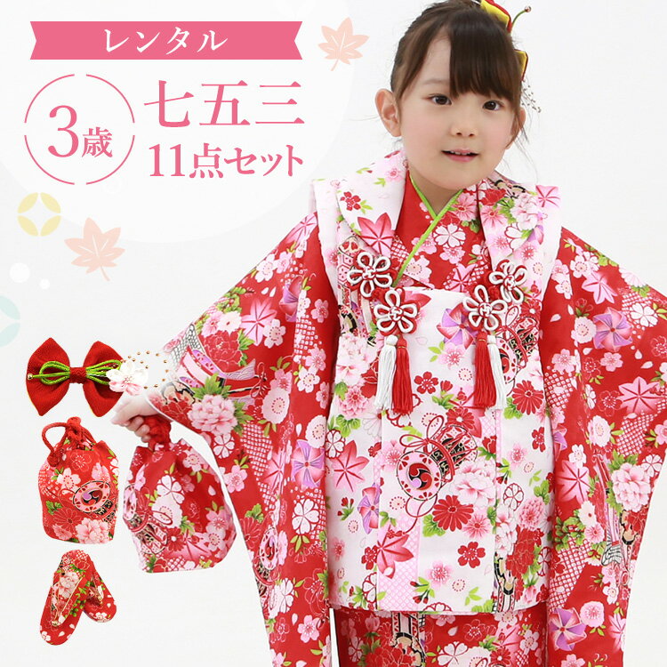 赤地に鼓と御所車 被布セット 着物 11点 フルセット レンタル かわいい 3歳 女の子 子供 草履バッグ 髪飾り 着付け小物 総柄 和柄 古典柄 鼓 御所車 桜 赤/白 【レンタル】