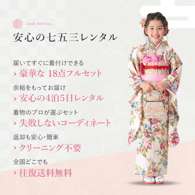 ▼アイテム キーワード 七五三 753 着物 きもの 四つ身 四ツ身 四つ身着物 四つ身セット よつみ 着物セット フルセット セット フルコーデ フルコーディネート 衣装 貸衣装 レンタル 七五三レンタル 四つ身レンタル レンタル着物 7歳 7歳用 七歳 七歳用 7才 女の子 女子 女児 子供 こども 子ども ガール キッズ 七五三参り お正月 正月 初詣 雛祭り ひな祭り ひなまつり 桃の節句 七草祝い 七草 結婚式 入学式 卒園式 発表会 誕生日 記念日 お祝い 祝着 和服 和装 和柄 和風 結び帯 作り帯 帯 志古貴 しごき 帯締め 箱せこ 箱迫 筥迫 はこせこ 箱迫セット 箱せこセット バッグ 鞄 髪飾り 草履 重ね衿 長襦袢 扇子 腰紐 足袋 着付け小物 前撮り 記念撮影 撮影 宅配 発送 京都 老舗 おすすめ 豪華 華やか おしゃれ お洒落 かわいい 可愛い カワイイ モダン レトロ 総柄 花柄 洋柄 洋風 115cm 120cm 125cm 生成り クリーム ピンク 薔薇 バラ ばら生成り地にアンティークローズ 七五三・お正月・雛祭りなどのお祝い事に着ていただける「7歳用着物&結び帯」に、着付け小物が付いた18点フルセットをお届けします♪