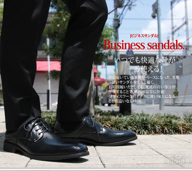 ビジネスサンダルは踵がないので、脱ぎ履きも楽!スーツと合わせれば一見ビジネスシューズにしか見えません。