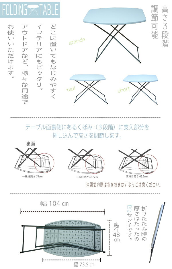 品番 YS-75-3X(3段階調節) 材質 天板:HDPE(高密度ポリエチレン) 表面の加工:紛体塗装 パイプ:スチール 加工方法:中空成型 カラー ホワイト サイズ 使用時:73.5×48×H74/68/62(cm) 耐荷重:約25kg 備考 脚部を折りたたみコンパクトに収納できる(折りたたみ時厚さ5cm)折りたたみレジャーテーブルです。
