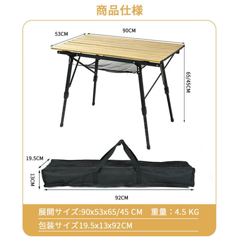 アウトドアテーブル 折りたたみ ロールテーブル キャンプテーブル 高さ調節 収納袋付き 軽量 持ち運び便利 ナイロンメッシュ付き アルミテーブル レジャーテーブル コンパクト キャンプ用 バーベキュー ピクニック 【商品仕様】90x53x65/45 CM 重量:4.5 KG 包装サイズ19.5x13x92CM。