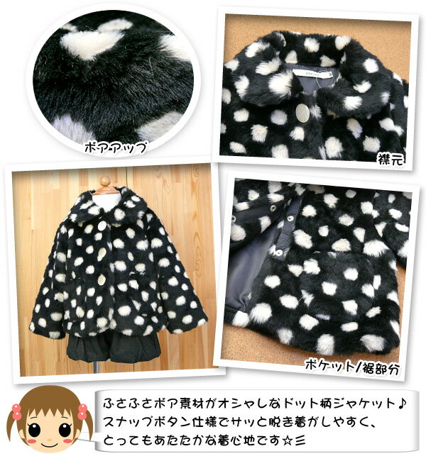 【特 長】 ・ドット柄 ・ボア素材 ・スナップボタン ・ポケット2P 【素 材】 [表地] ・(基布)ポリエステル100% ・(ファー部分)アクリル85% ポリエステル15% ・(裏地)ポリエステル100% 【サイズ】 着丈 身幅 肩幅 袖丈 【90cm】 34cm 35cm 29cm 29cm 【95cm】 36cm 37cm 29cm 32cm (単位:cm) 実際に採寸した平均値です。