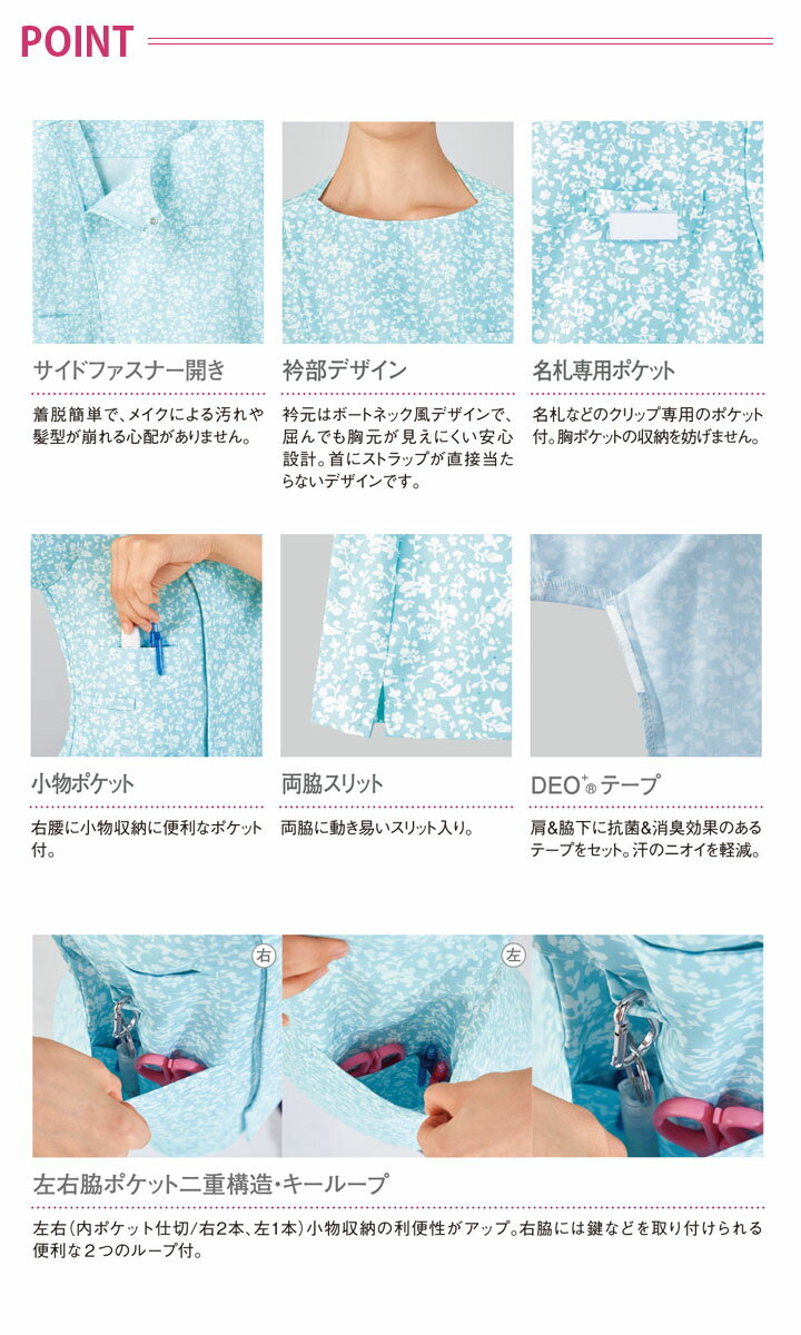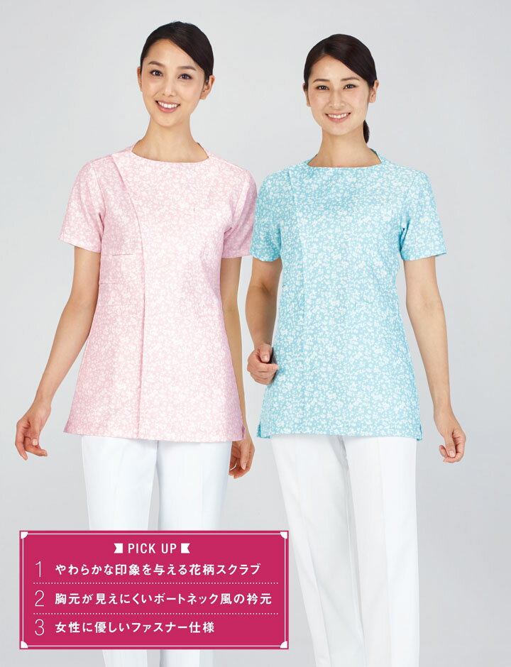■ホワイセル レディーススクラブ WH11595 やわらかな印象を与える花柄スクラブ 胸元が見えにくいボーとネック風の衿元 女性に優しいファスナー仕様 モニター環境により画像の色と現物の色が多少違って見えます。
