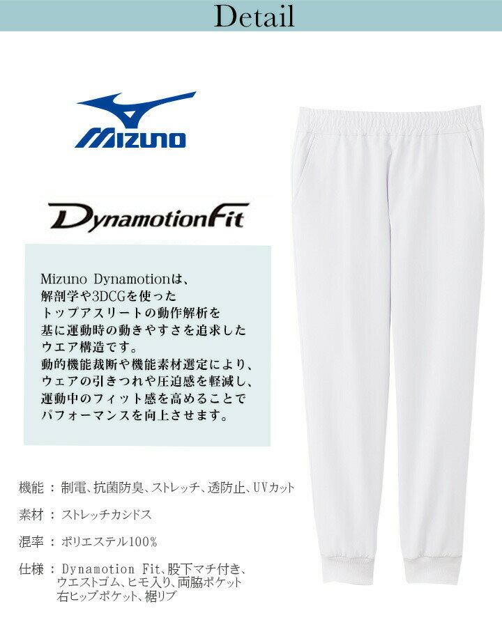 ミズノ/MIZUNO MZ-0122 ジョガーパンツ(兼用) 【素材特徴】 防透加工 UVカット 遮熱加工 SOFT加工 ノーアイロン 【商品特徴】 ●インナーに悩まず!透けにくい素材 高い透け防止機能のある素材だから、白衣の下のインナーにもう悩まない! やわらかい手触りで着心地もよく、摩擦で生地が傷まないように摩擦防融機能があるから 長くキレイに着られます。